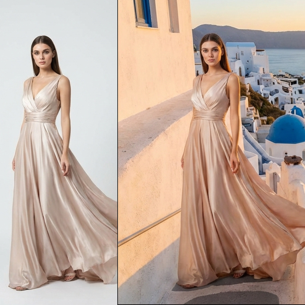 Transform your product photos with AI-powered background removal and replacement. Place your garments in any setting — from studio white to Santorini sunsets — in one click.